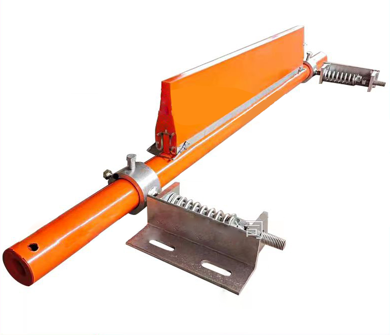 用于帶式輸送機回程皮帶下表面附屬物的第二次清掃。安裝在卸載滾筒下方回程段位置,解決殘留物料在輸送機回程段灑落造成的環(huán)境污染和殘留物料粘黏在托輥上引起的回程皮帶跑偏的問題。